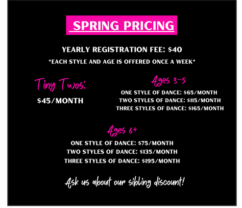 Tiny TwosOur Tiny Twos class is for our youngest dancers that are 18 months old up until they turn 3 years old. This class is true "Introduction to Dance" class as our little ones learn a little bit of all styles of dance. Our curriculum is based off of Ballet, Jazz, Hip Hop, and Acro style classes. This is also a great way for your little one to figure out what style(s) of dance they like the best!